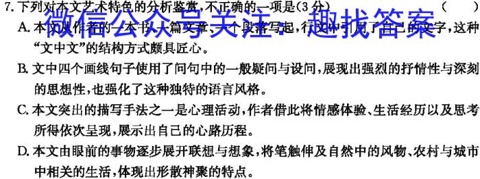 7.下列对本文艺术特色的分析鉴赏,不正确的一项是(3分)()A.本文从作者的一本书、一篇文章、一个段落写起,行文中引用了自己的文字,这种“文中文”的结构方式颇具匠心。B.文中四个画线句子使用了问句中的一般疑问与设问,展现出强烈的抒情性与深刻的思想性,也强化了这种独特的语言风格。C.本文突出的描写手法之一是心理活动,作者借此将情感体验、生活经历以及思考所得依次呈现,展示出自己的心路历程。D.本文由眼前的事物逐步展开联想与想象,将笔触伸及自然中的风物、农村与城市中相关的生活,体现出形散神聚的特点。