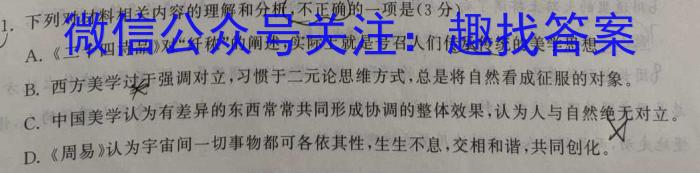1.1..下列对材料相关内容的理解和分析,不正确的一项是(3分)A.《二十四诗品》对“纤称”的阐述,实际上就是号召人们传承传统的美学思想。B.西方美学过强调对立,习惯于二元论思维方式,总是将自然看成征服的对象。C.中国美学认为有差异的东西常常共同形成协调的整体效果,认为人与自然绝无对立。D.《周易》认为宇宙间一切事物都可各依其性,生生不息,交相和谐,共同创化。