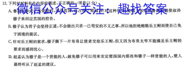 12.下列对材料有关内容的概述,不正确的一项是(3分)A.鲁国的季武子违背盟约,攻伐莒国,还占领了郓城,针对这种行为,楚国主张杀掉鲁国的盟使叔孙穆子来回应莒国的控告。B.穆子认为君子会坚持正道,不会做出只求一已苟安的不义之事,所以他拒绝贿赂乐王鲋而使自己免于困境的提议。C.针对乐王鲋的索求,穆子撕下一片布帛让使者交给乐王鲋,但又因为布帛太窄不能满足乐王鲋的要求而感到忧心。D.赵孟认为穆子是一个贤能的人,赦免穆子可以用来安定楚国国内那些和穆子一样贤能的人,楚人最终听从了赵孟的建议。