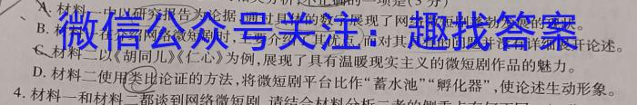 D、3.下列对材料一和材料二论证的相关分析,不正确的一项是(3分).材料一中以研究报告为论据,通过具体的数字展现了网络微短剧蓬勃发展的现状。B.材料一在介绍网络微短剧时,主要介绍了其优点,而对其具有的问题并没有详细展开论述。C.材料二以《胡同儿》《仁心》为例,展现了具有温暖现实主义的微短剧作品的魅力。D.材料二使用类比论证的方法,将微短剧平台比作“蓄水池”“孵化器”,使论述生动形象。