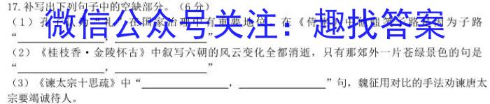 17.补写出下列句子中的空缺部分。(6分)(1)孔子认为“礼”在国家治理中有重要地位。在《侍坐》中他嗤笑子路是因为子路“,”(2)《桂枝香·金陵怀古》中叙写六朝的风云变化全都消逝,只有那郊外一片苍绿景色的句是“,”(3)《谏太宗十思疏》中“.”句,魏征用对比的手法劝谏唐太宗要竭诚待人。