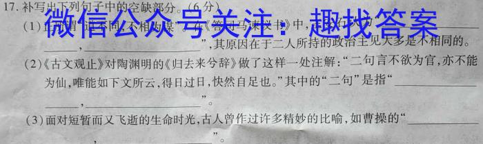 17.补写出下列句子中的空缺部分。(6分)(1)正所谓“道不同,不相为谋”。在《答司马谏议书》中,王安石认为”,”,其原因在于二人所持的政治主见大多是不相同的。(2)《古文观止》对陶渊明的《归去来兮辞》做了这样一处注解:“二句言不欲为官,亦不能为仙,唯能如下文所云,得日过日,快然自足也。”其中的“二句”是指“,”。(3)面对短暂而又飞逝的生命时光,古人曾作过许多精妙的比喻,如曹操的“,”。