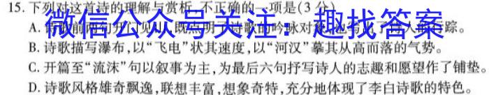 15.下列对这首诗的理解与赏析,不正确的一项是(3分)A.诗歌前两句开门见山,既点明了诗歌的吟咏对象,也写出了诗人的行踪。B.诗歌描写瀑布,以“飞电”状其速度,以“河汉”摹其从高而落的气势。C.开篇至“流沫”句以叙事为主,为最后六句抒写诗人的志趣和愿望作了铺垫。D.诗歌风格雄奇飘逸,联想丰富,想象奇特,充分地体现了李白诗歌的特色。