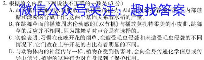 2.根据原文内容,下列说法不正确的一项是(3分)A.rbeS基因关系到水稻吸收二氧化碳的能力,Ald基因掌控着水稻种子内部蔗糖和淀粉的合成工作,这两个基因关系着水稻的产量。B.在跳舞草面前播放周杰伦动感的《双节棍》与播放莫扎特柔美的小夜曲,跳舞草的反应并不相同,因为跳舞草对声音是有选择的。C.实验表明,习惯在夜晚开花的烟草,在遭受毛虫侵袭和未遭受毛虫侵袭的不同情况下,它们改在上午开花的占比有着明显的不同。D.与动物体内的神经传导一样,植物在受到伤害时,会向全身传递化学信息或传导电信号,植物的这种行为对自身起到了保护作用。
