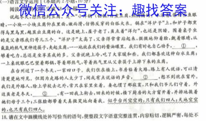 (一)语言文字运用1(本题共2小题,10分阅读下面的文字,完成18∼10题。说起冬天,忽然想到豆腐,是一“小洋锅”(铝锅)白煮丘腐,热腾腾的。水滚着,像好些鱼眼晴,一小块一小块腐仰在里面,嫩而滑,仿反穿的白大衣。锅在“洋炉子”上,和炉子都得鸟黑鸟黑,越黑出豆腐的白,这是晚上,屋子老了,虽点着“洋灯”,也还是暗,围着桌子的是父亲我们哥儿三个。“洋炉子”太高了,父亲得常常站起来,撒微地着脸,着眼睛,从的热气里伸进筷子,夹起豆腐,一一地放在我们的普油碟里,我们有时也自己动手,够着吃力,总还是坐率其成的多,父亲说晚上冷,吃了大家暖和些。我们都喜欢这种白水豆腐;一上来就眼已望着那锅,等着环热气,等着热气里从父亲筷子上掉下来的豆腐,在台州过了一个冬天,一家四口子。我们住在楼上,书房临着大路,路上有人说话,可以清清楚楚地听见,但为走路的人太少了,或有点说话的声音,,想不到就在富外,我们是外路人,除上学校去之外,常只在家里坐着。要也惯了那寂宽,只和我们爷儿们中着。外边虽老是冬天,@,有一回我上街去,四来的时候,楼下厨房的大方窗开着,并排地挨着她们母子三个;三张脸都带着天真微笑地向着我。但乎台空实的,只有我们人天地的,也只有我们人,