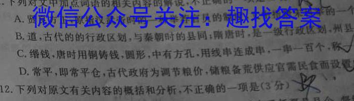 第五琦始始权盐B佐军兴兴C晏D代之法益E密G利无造11.下列对文中加点词语的相关内容的解说,不正确的一项是(3分)CA.贤良方正,原指汉武帝时的一种举荐官员的制度,文中指唐宋科举的B.道,古代的的行政区划,与秦朝时的县同;隋唐时,是一级行政区划,州县C.缗钱,唐时用铜铸钱,圆形,中有方孔,用线串连成串,一串一百个,称D.常平,即常平仓,古代政府为调节粮价,储粮备荒供应官需民食而设置