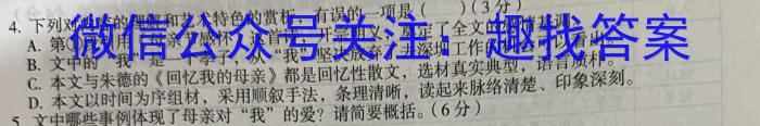 4.下列对内容的理解和艺术特色的赏析,有误的一项是()(3分)A.第①段引用《母亲节感怀》这首诗,开宗明义,奠定了全文的感情基调。。B.文中的“我”是一个孝子,从“我”坚决放弃了去深圳工作的机会可以看出。C.本文与的《回忆我的母亲》都是回忆性散文,选材真实典型,语言质朴。D.本文以时间为序组材,采用顺叙手法,条理清晰,读起来脉络清楚、印象深刻。5.文中哪些事例体现了母亲对“我”的爱?请简要概括。(6分)