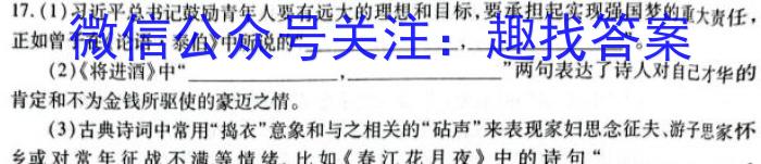 17.(1)鼓励青年人要有远大的理想和目标,要承担起实现强国梦的重大责任,正如曾子在《论语·泰伯》中所说的“,”。(2)《将进酒》中“,”两句表达了诗人对自己才华的肯定和不为金钱所驱使的豪迈之情。