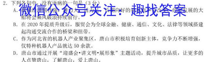 2.下列各句中,没有语病的一句是(3分)A.我国经济韧性强,潜力大,活力足,长期向好的基本面不会改变,经济发展的大船将会乘风破浪持续前行。B.在2020年提质升级后,服贸会为全球金融、健康、通信、文化、法律等领域搭建起沟通交流合作的桥梁和纽带。C.作为河北省的机器人产业聚集区,唐山市积极培育创新主体,竞争力不断增强,仅特种机器人产品就达50余款。D.唐山市通过开展“迎盛会·讲文明·展形象”主题活动,提升城市品质,让更多的人点赞唐山,了解唐山,爱上唐山。