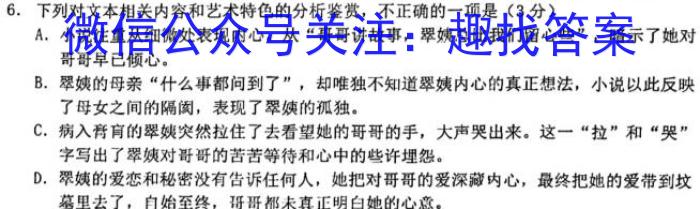 6.下列对文本相关内容和艺术特色的分析鉴赏,不正确的一项是(3分)A.小说注重从细微处表现内心。从“哥哥讲故事,翠姨总比我们留心些”,暗示了她对哥哥早已倾心。B.翠姨的母亲“什么事都问到了”,却唯独不知道翠姨内心的真正想法,小说以此反映了母女之间的隔阂,表现了翠姨的孤独。C.病入膏育的翠姨突然拉住了去看望她的哥哥的手,大声哭出来。这一“拉”和“哭”字写出了翠对哥哥的苦苦等待和心中的些许埋怨。D.翠姨的爱恋和秘密没有告诉任何人,她把对哥哥的爱深藏内心,最终把她的爱带到坟墓里去了,自始至终,哥哥都未真正明白她的心意。