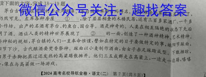 (一)语言文字运用I(本题共2小题,7分)阅读下面的文字,完成18~19题。茅台古镇建在弯曲的赤水河两岸。茅台因茅草祭台而得名。河谷滩涂芽草现在虽然少了,但仍然可见。左岸各种房屋①D,除了层层相叠的木楼民居,还有三百多家酒厂、一千多家小作坊。出产的名酒有茅台、钓鱼台、国台等。酒是神奇的。人类在相互隔绝的状态下先后发明了酒。酒让人人类的精神世界展现了的一面,创造了一种酒神精神、艺术精神。一些神秘的规矩,茅台镇的人们一直奉命惟谨,譬如在特定的日子要做特定的事,端阳节跺曲,重阳节下沙。古代酿酒要焚香祭神。踩曲以小麦制作酒曲由女子赤足踩踏成型。下摊晾,则由男子赤脚把蒸过还发热的高粱踢散摊开。他们三五成群走在高粱上,一边走一边踢,嘻嘻哈哈,像在与高粱做一场游戏。