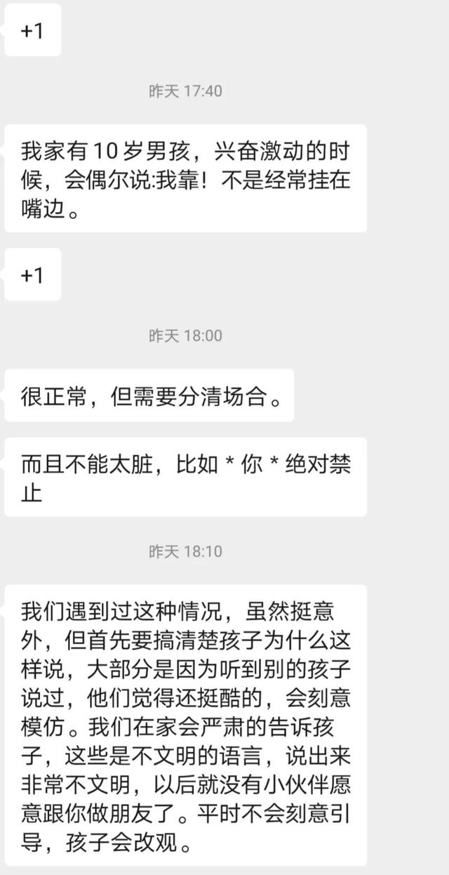 晚上,我跟他聊关于脏话这个问题。他说同学们平时玩闹相处都会说,但这种互怼大家都没有恶意,也不会生气。而且,他说自己会分清场合,知道啥时不能说不该说。